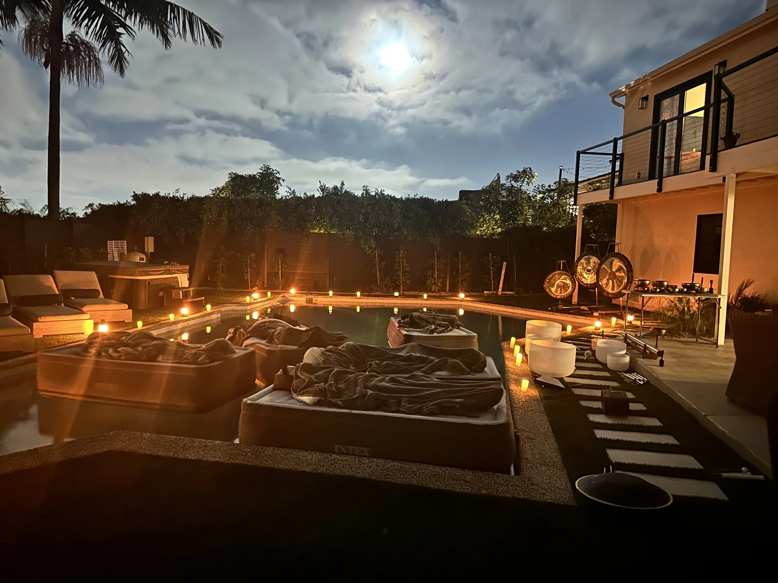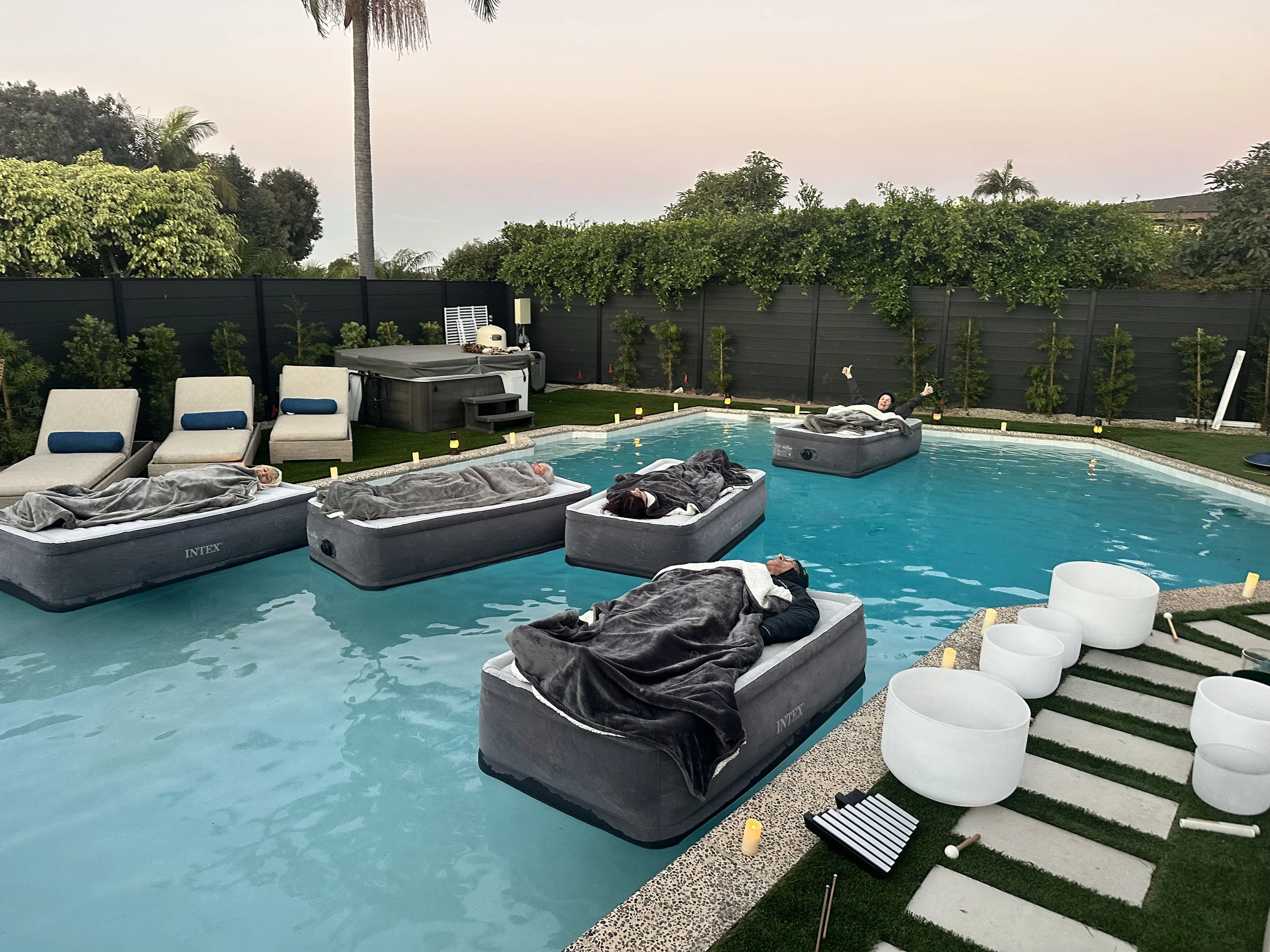 A new offering where you will lie on an Intex Air Mattress that floats in a large pool of water in a private backyard. Listen to the sounds fill up your being as you are float gently. Only 6 spots so please sign up quickly!